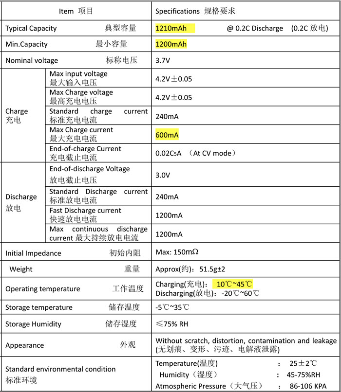 ¡Þ Typical Capacity : 1210mAh (0.2C Discharge) ¡Þ Minimum capacity : 1200mAh ¡Þ Nominal Voltage : 3.7V ¡Þ Max Charge Voltage : 4.2V ¡Þ Standard Charge Current : 240mA