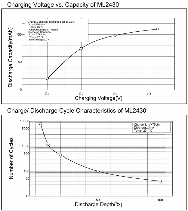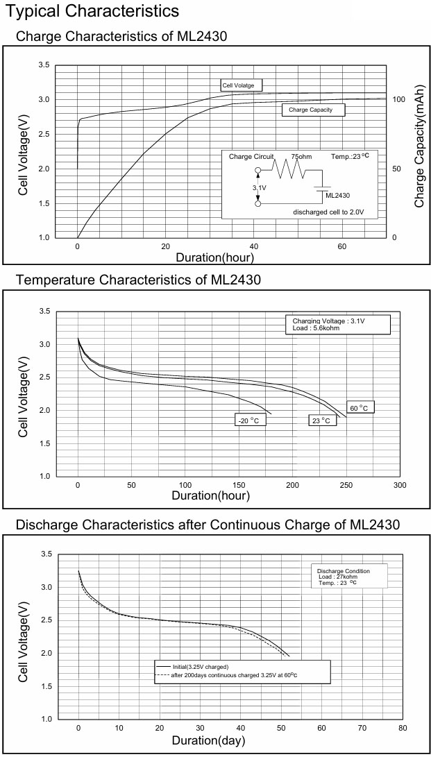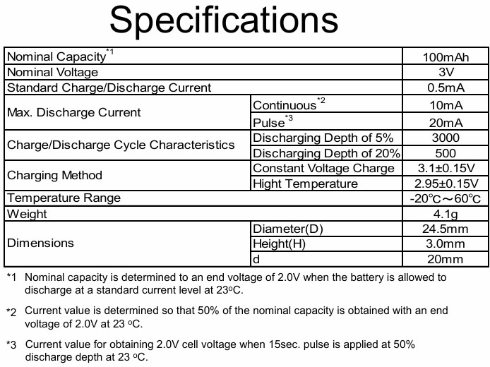 ¡Þ Nominal Capacity : 200mAh ¡Þ Nominal Voltage : 3V ¡Þ Standard Charge/Discharge Current : 10mA ¡Þ Max. Discharge Current : (Continuous) 20mA, (Pulse) 40mA ¡Þ Charge/Discharge Cycle Characteristics - Discharging Depth of 5% : 3000 - Discharging Depth of 20% : 500 ¡Þ Charging Method - Constant Voltage Charge : 3.1¡¾0.15V - Hight Temperature : 2.95¡¾0.15V ¡Þ Temperature Range : -20 ~ 60¡É