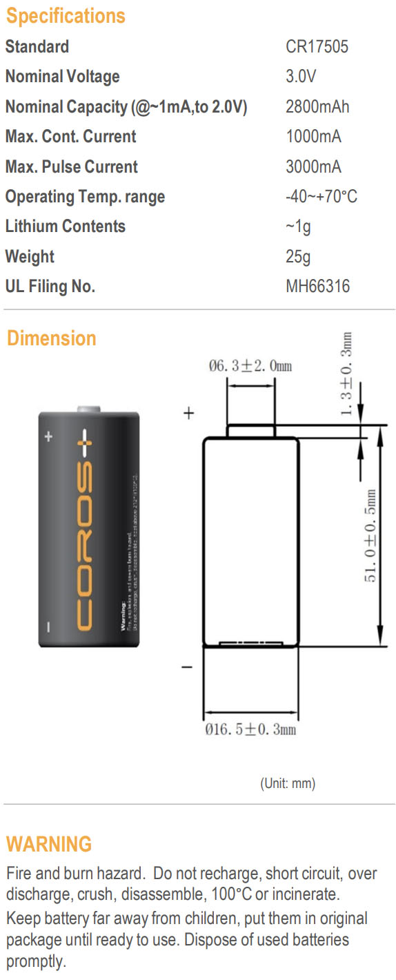 ¡á Äڷνº ¸®Æ¬1Â÷¹èÅ͸® CR17505 (Size A 3V 2800mAh) 6°³¸¦ Á÷·Ä·Î Á¶¸³ÇÏ¿© Àü¾ÐÀ» ³ôÀ̰í Ãâ·ÂÀü¼±À» ¿¬°áÇÏ°í ¼öÃàÇʸ§(»ö±òÀº º¯°æµÉ ¼ö ÀÖÀ½)À¸·Î Æ÷ÀåÇÏ¿´½À´Ï´Ù.¤Ñ ±Ø¼ºÁÖÀÇ : Àü¼±ÀÇ »¡°£»öÀº Ç÷¯½º(+), °ËÀº»öÀº ¸¶À̳ʽº(-)