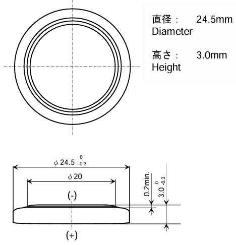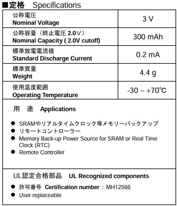 ¡Þ Nominal Voltage : 3V ¡Þ Nominal Capacity : 300mAh ¡Þ Standard Discharge Current : 0.2mA ¡Þ Size : 3.2 x 24.5mm