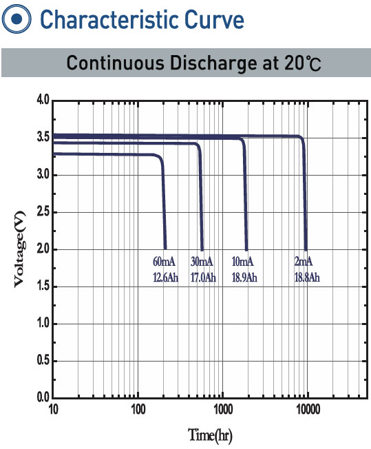 Àü¼±ÀÇ (ÁÂ, ¿ì À§Ä¡È®ÀÎ) »¡°£»öÀº Ç÷¯½º(+), °ËÀº»ö ¸¶À̳ʽº(-) ¡Þ Nominal Voltage : 3.6V ¡Þ Nominal capacity : 19Ah (19000mAh) ¡Þ Maximum recommended continuous current : 100mA ¡Þ Max. pulse discharge current : Over 250mA ¡Þ Size : (D) 34(42.5) x 62mm (about) ¡Þ Weight : 103g (about) ¡Þ Operating temperature range : -55 ~ 85¡É